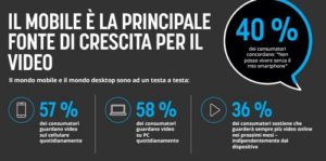 Ormai il i video online rappresentano il 50% del traffico mobile, il 78% delle persone guarda video online ogni settimana e il 55% lo fa almeno una volta al giorno. Inoltre, nel 2015 il video ha occupato il 57% del traffico internet dei consumatori, dato che è salito al al 69% durante il 2017 e che toccherà il 79% nel 2018.